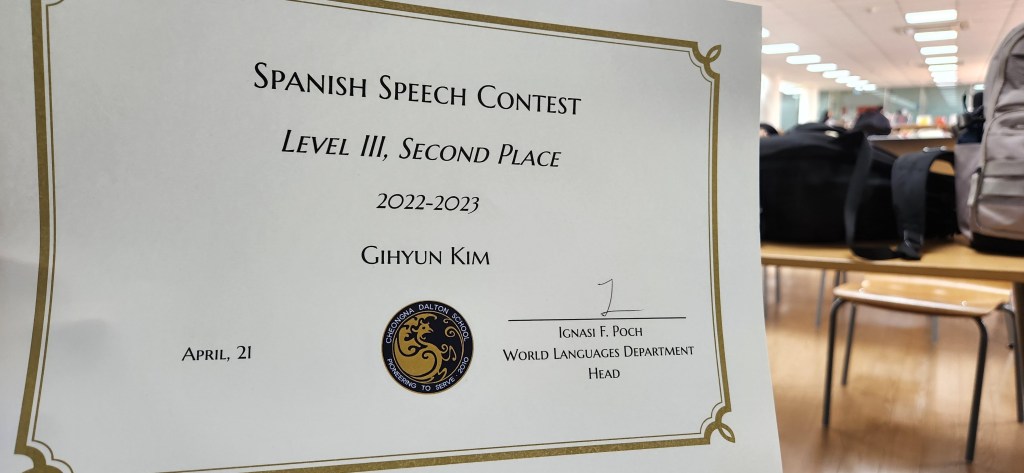 Summary/Reflection: 10th Grade has been a completely different experience compared to 9th grade. I started to think more carefully about my future and university as well as future careers. I also started taking AP classes in school and started taking more advanced classes in mathematics, and language. I was also able to compete in numerous competitions both in and outside of school such as NHD (National History Day), DSO (Dalton Science Olympiad), DBC (Dalton Business Competition), and WLSC (World Language Speech Contest). I gained a considerable amount of new information as well as new knowledge as I prepared and endured the different competitons. For example, while preparing for the WLSC, I studied and memorized the different words and grammatic concepts of the Spanish language and learned how to be less nervous when speaking in front of a large group of people and presenting my topic and idea. For this contest, I received the second place award for the Spanish III division and subsequently received an A for the overall grade of Spanish III.