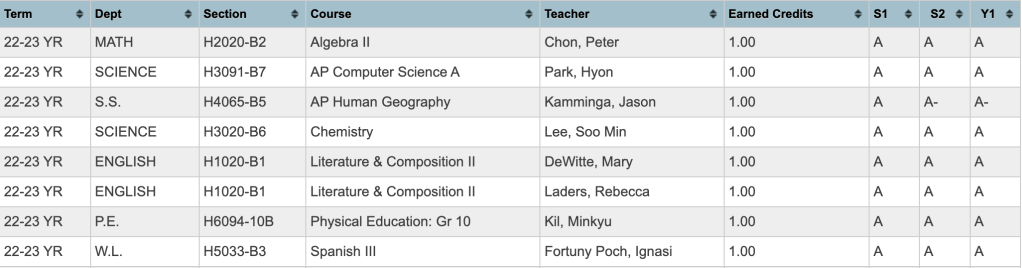 In terms of GPA, there were setbacks in the second semester as my AP Human Geography grade fell from A to A- after a miserable result from my Unit 4 exam. After this test, my grade fell to C- so there was a lot of work to do to recover my GPA and my grade for AP HG. On the other hand, for other subjects, my grades remaind the same and finished the school year with an overall grade of A.