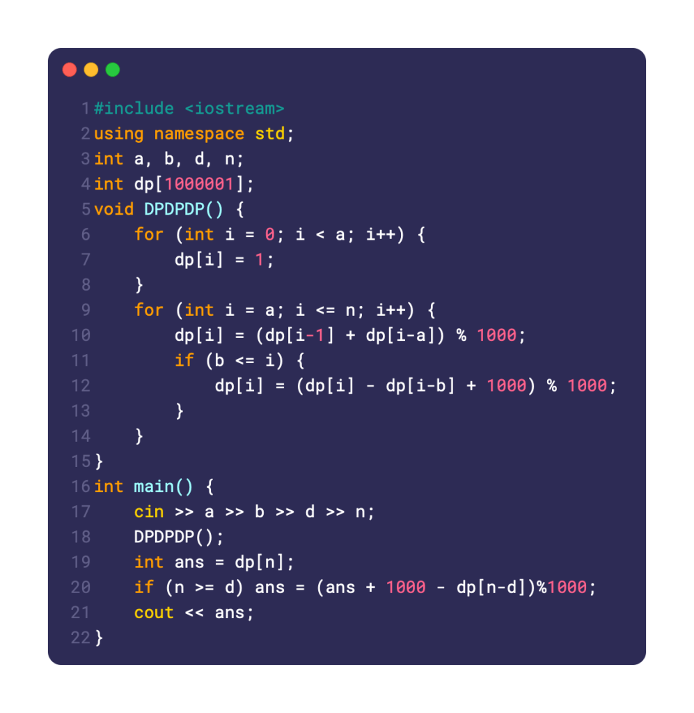For paramecium breeding information a, b, and d, write a program that outputs the remainder of dividing the number of parameciums alive on the Nth day after placing one newly born paramecium in a tank by 1000.