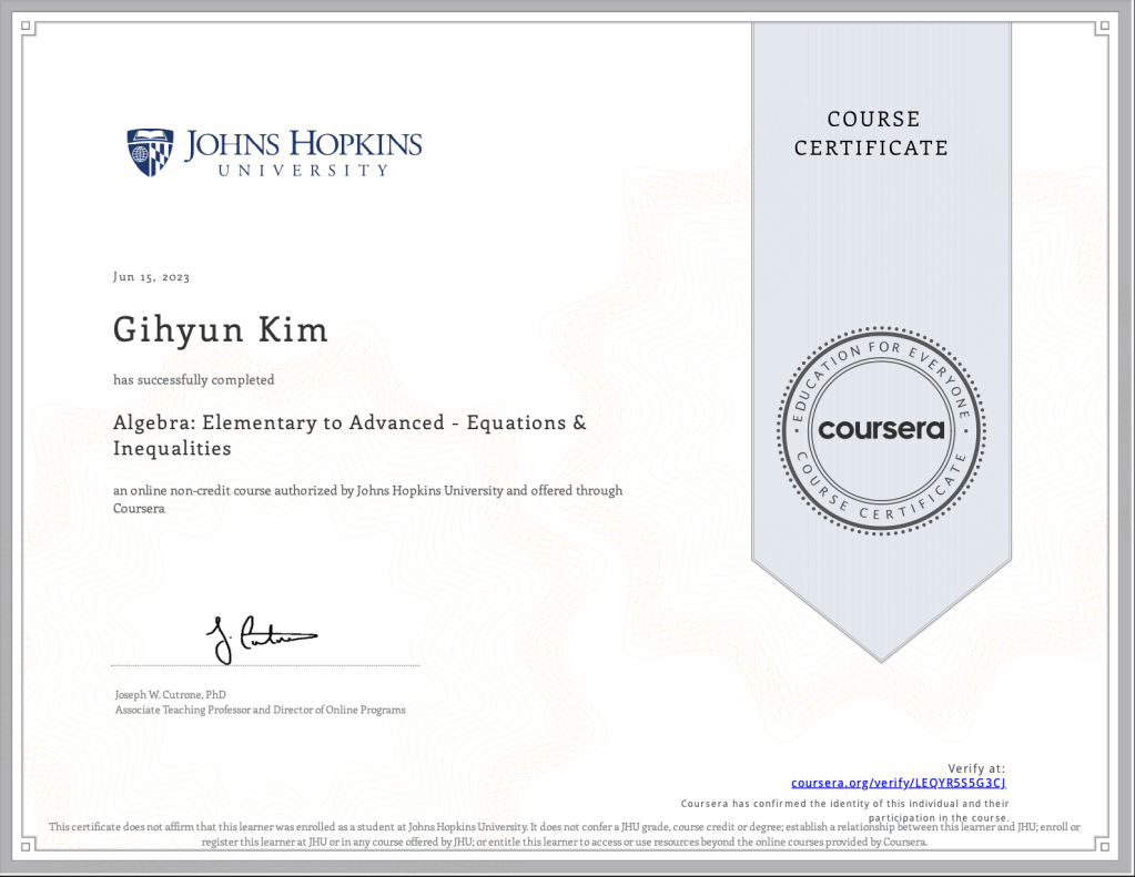 In this coursera course, I went over the basics of algebra and functions as I will be going to be learning AP Calculus BC in 11th grade and will be taking university level calculus courses in Coursera. It was a very interesting course and as I was taking this course, I was very excited that I was taking a course offered by Johns Hopkins University and although this course is simply about basic algebra, it was fun learning about this and deepening my understanding of the fundamental concepts of math before diving into calculus.